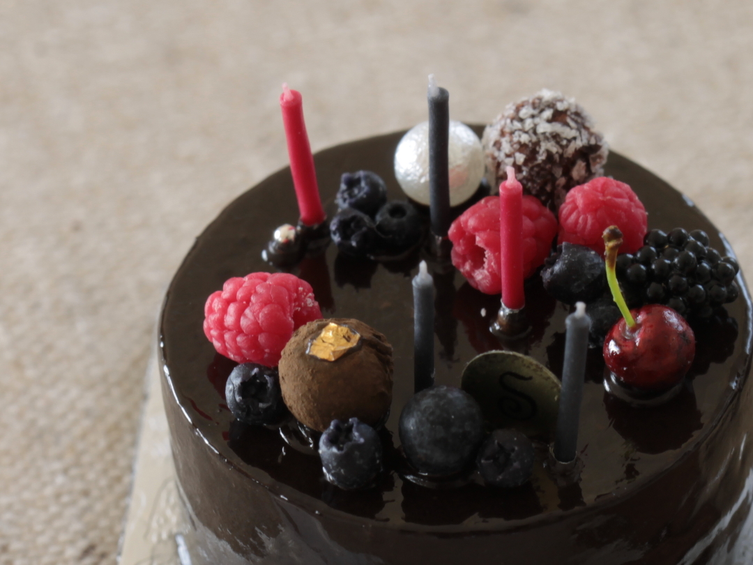 3、チョコレートケーキ(キャンドル、雪の結晶、ひいらぎ、バースデープレート)