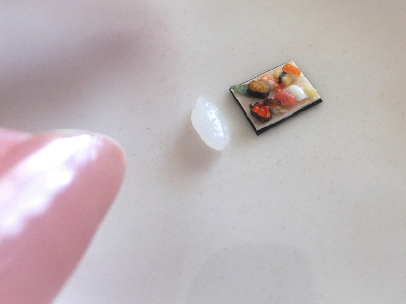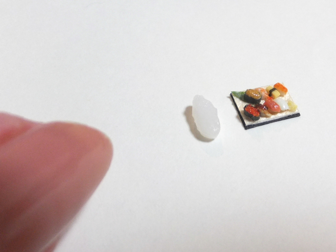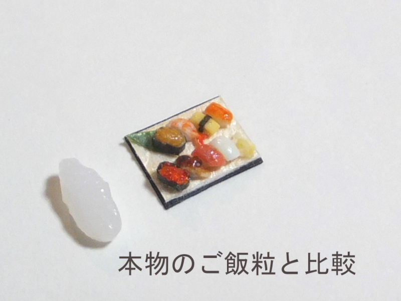 ↓ミニミニ寿司は約1/24のスケールで 本物のご飯粒と比較するとこんな感じです↓