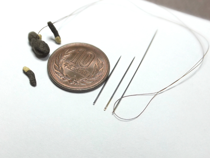 左:テディベア用針 真ん中:極細糸絹糸用針 右が使用している針